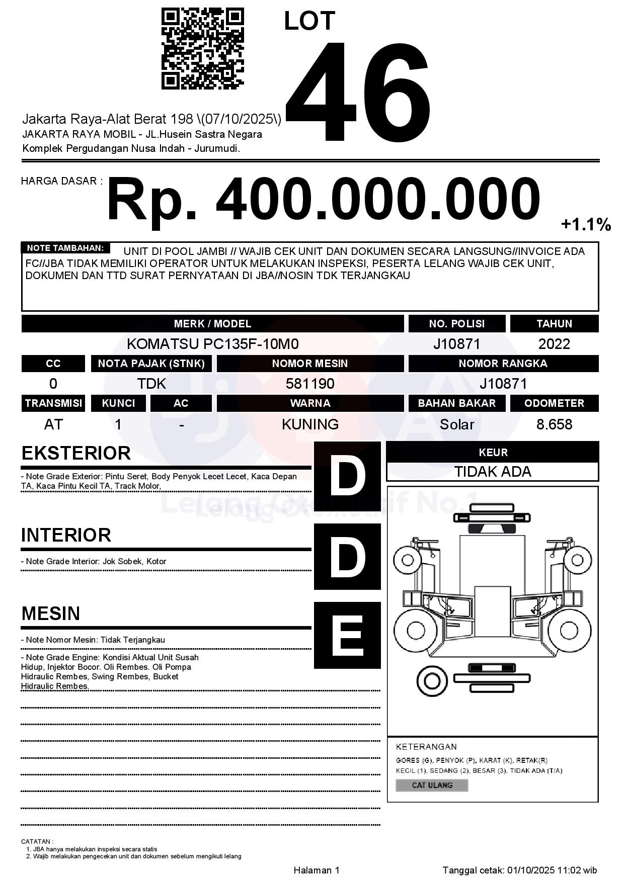 - CatatanUNIT DI POOL JAMBI // WAJIB CEK UNIT DAN DOKUMEN SECARA LANGSUNG//INVOICE ADA FC//JBA TIDAK MEMILIKI OPERATOR UNTUK MELAKUKAN INSPEKSI, PESERTA LELANG WAJIB CEK UNIT, DOKUMEN DAN TTD SURAT PERNYATAAN DI JBA//NOSIN TDK TERJANGKAU