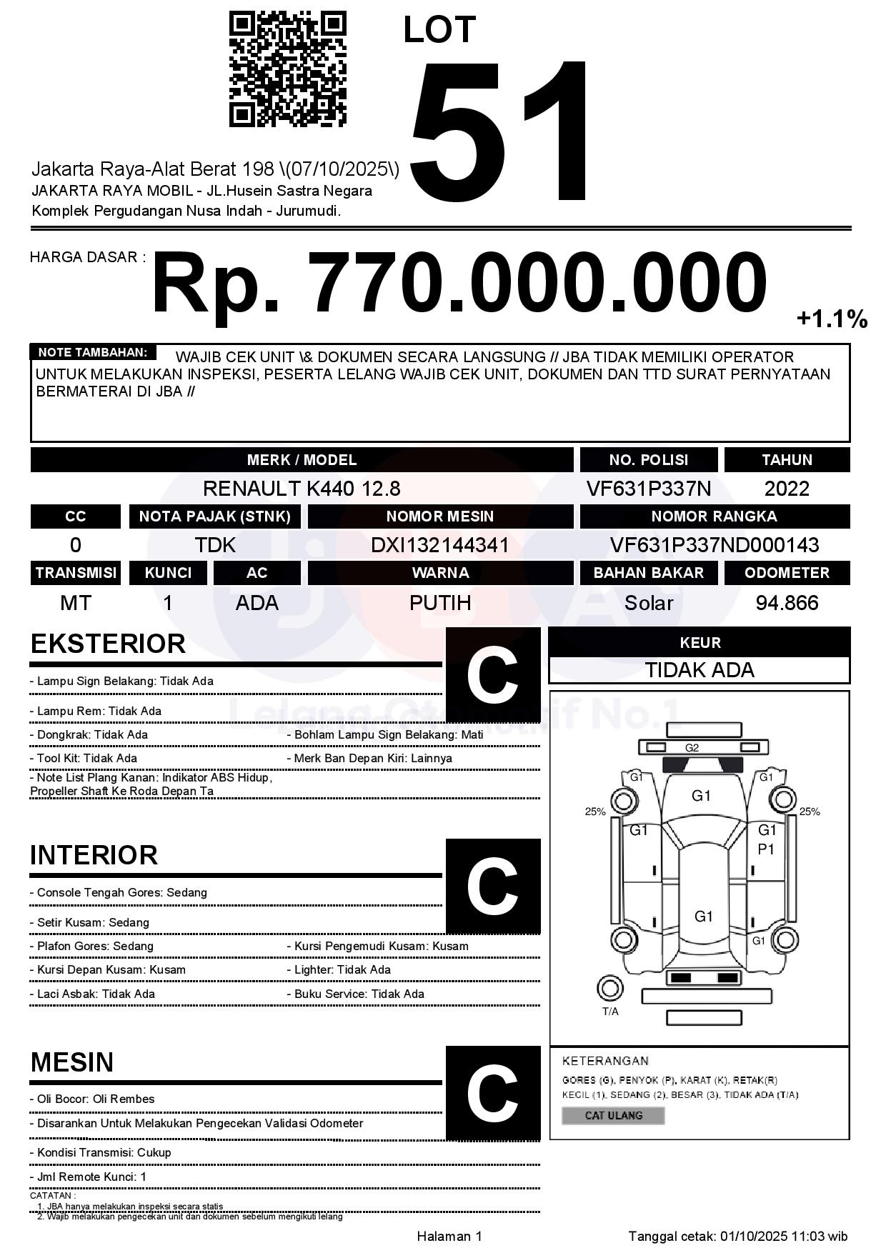 - CatatanWAJIB CEK UNIT & DOKUMEN SECARA LANGSUNG // JBA TIDAK MEMILIKI OPERATOR UNTUK MELAKUKAN INSPEKSI, PESERTA LELANG WAJIB CEK UNIT, DOKUMEN DAN TTD SURAT PERNYATAAN BERMATERAI DI JBA //