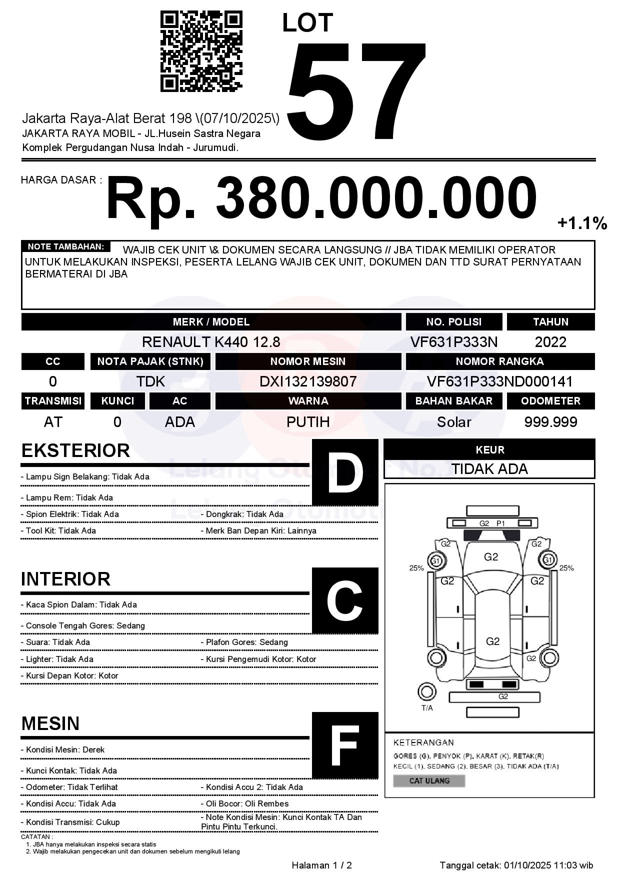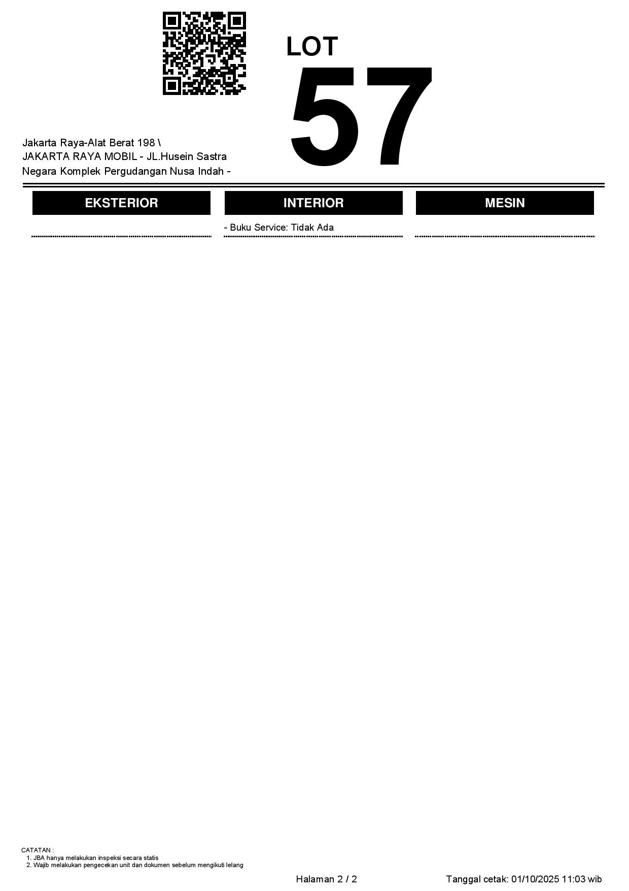 - CatatanWAJIB CEK UNIT & DOKUMEN SECARA LANGSUNG // JBA TIDAK MEMILIKI OPERATOR UNTUK MELAKUKAN INSPEKSI, PESERTA LELANG WAJIB CEK UNIT, DOKUMEN DAN TTD SURAT PERNYATAAN BERMATERAI DI JBA