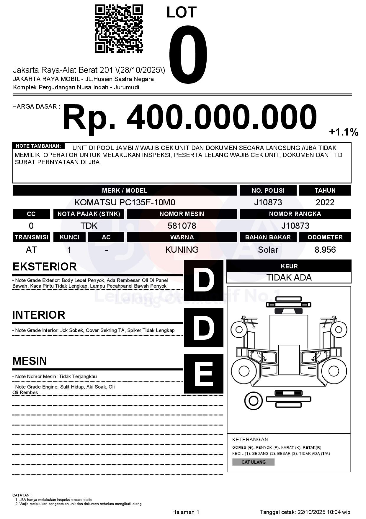- CatatanUNIT DI POOL JAMBI // WAJIB CEK UNIT DAN DOKUMEN SECARA LANGSUNG //JBA TIDAK MEMILIKI OPERATOR UNTUK MELAKUKAN INSPEKSI, PESERTA LELANG WAJIB CEK UNIT, DOKUMEN DAN TTD SURAT PERNYATAAN DI JBA