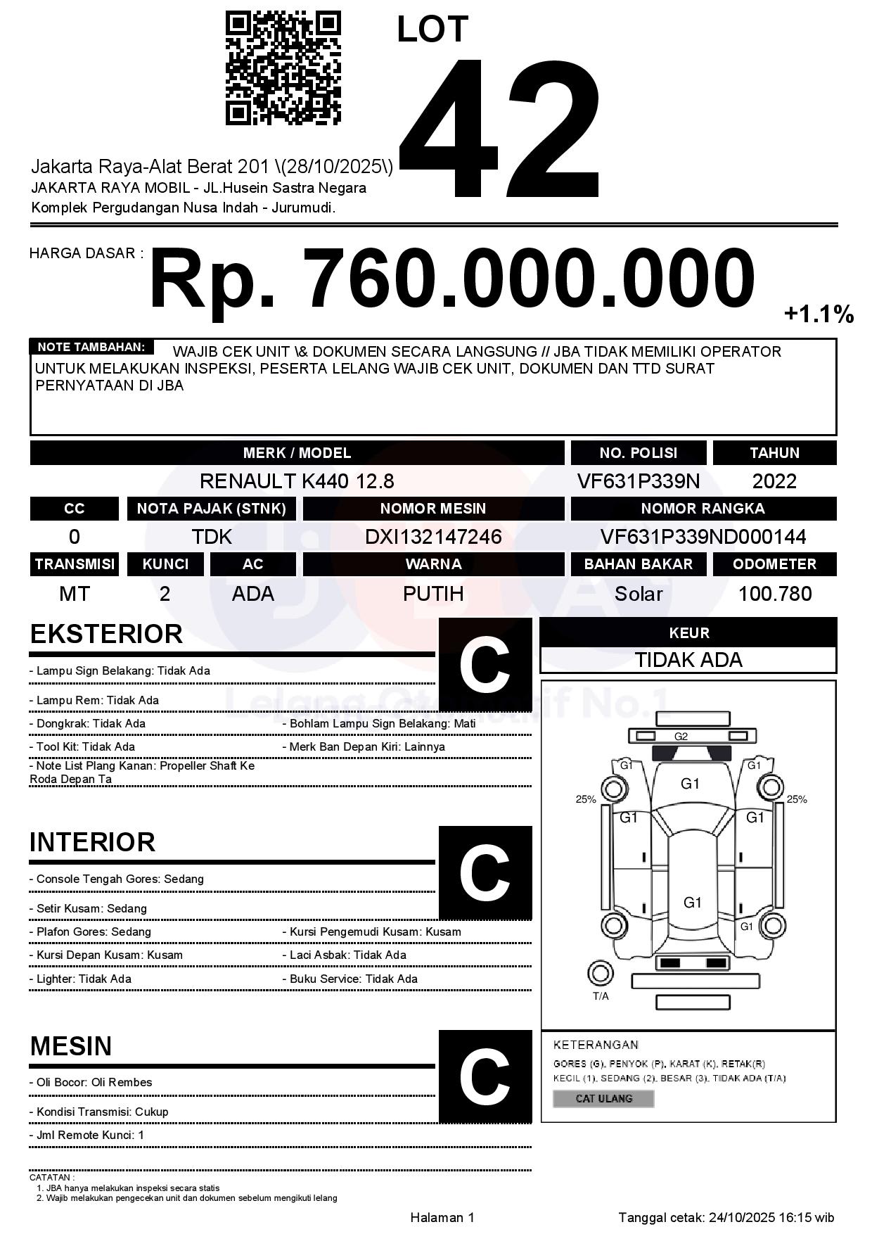 - CatatanWAJIB CEK UNIT & DOKUMEN SECARA LANGSUNG // JBA TIDAK MEMILIKI OPERATOR UNTUK MELAKUKAN INSPEKSI, PESERTA LELANG WAJIB CEK UNIT, DOKUMEN DAN TTD SURAT PERNYATAAN DI JBA