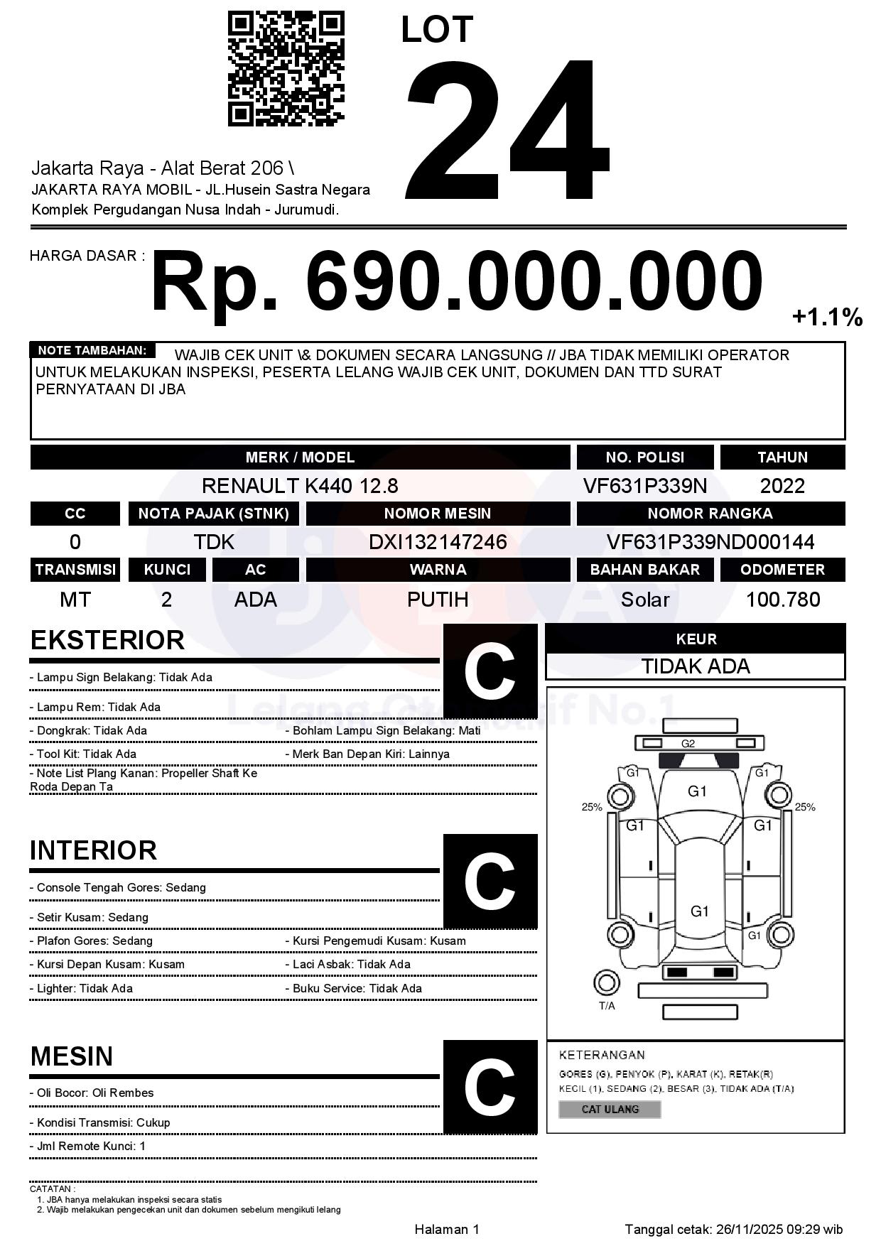 - CatatanWAJIB CEK UNIT & DOKUMEN SECARA LANGSUNG // JBA TIDAK MEMILIKI OPERATOR UNTUK MELAKUKAN INSPEKSI, PESERTA LELANG WAJIB CEK UNIT, DOKUMEN DAN TTD SURAT PERNYATAAN DI JBA