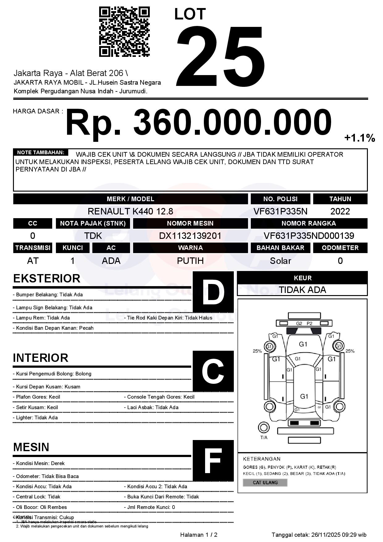 - CatatanWAJIB CEK UNIT & DOKUMEN SECARA LANGSUNG // JBA TIDAK MEMILIKI OPERATOR UNTUK MELAKUKAN INSPEKSI, PESERTA LELANG WAJIB CEK UNIT, DOKUMEN DAN TTD SURAT PERNYATAAN DI JBA //