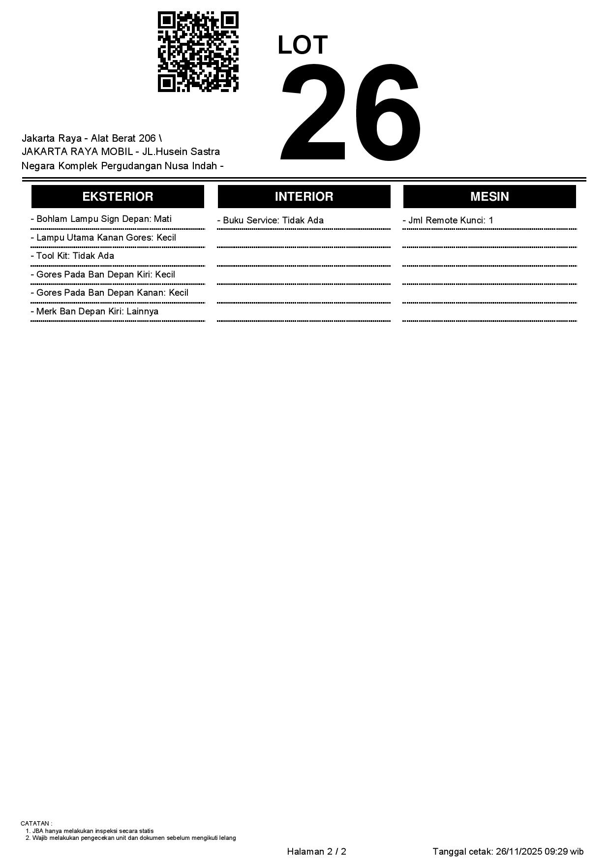 - CatatanWAJIB CEK UNIT & DOKUMEN SECARA LANGSUNG // JBA TIDAK MEMILIKI OPERATOR UNTUK MELAKUKAN INSPEKSI, PESERTA LELANG WAJIB CEK UNIT, DOKUMEN DAN TTD SURAT PERNYATAAN DI JBA