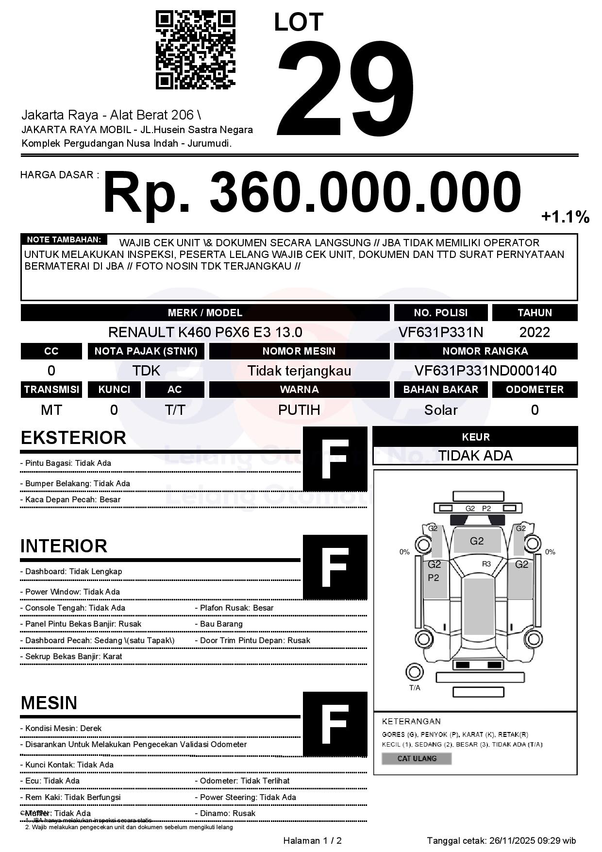 - CatatanWAJIB CEK UNIT & DOKUMEN SECARA LANGSUNG // JBA TIDAK MEMILIKI OPERATOR UNTUK MELAKUKAN INSPEKSI, PESERTA LELANG WAJIB CEK UNIT, DOKUMEN DAN TTD SURAT PERNYATAAN BERMATERAI DI JBA // FOTO NOSIN TDK TERJANGKAU //