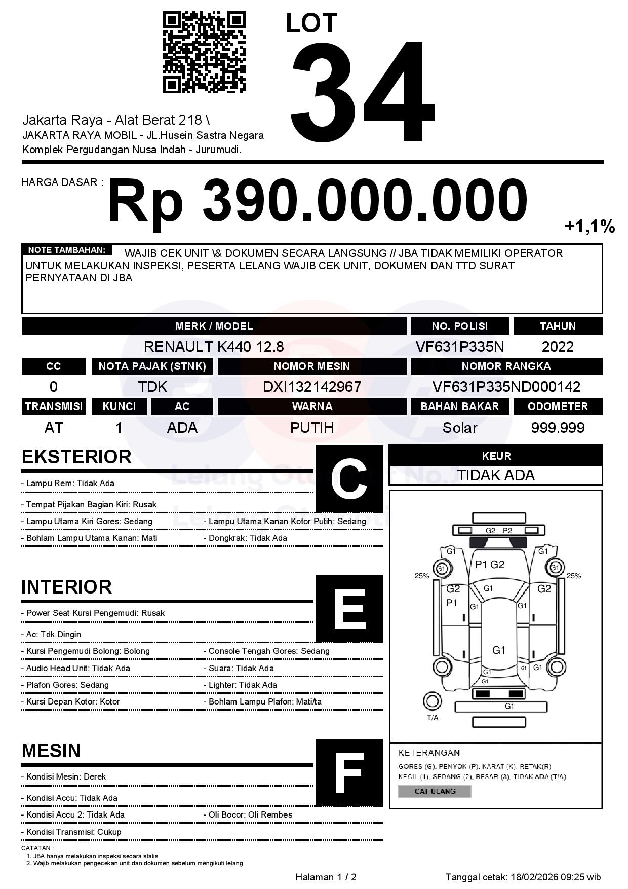 - CatatanWAJIB CEK UNIT & DOKUMEN SECARA LANGSUNG // JBA TIDAK MEMILIKI OPERATOR UNTUK MELAKUKAN INSPEKSI, PESERTA LELANG WAJIB CEK UNIT, DOKUMEN DAN TTD SURAT PERNYATAAN DI JBA