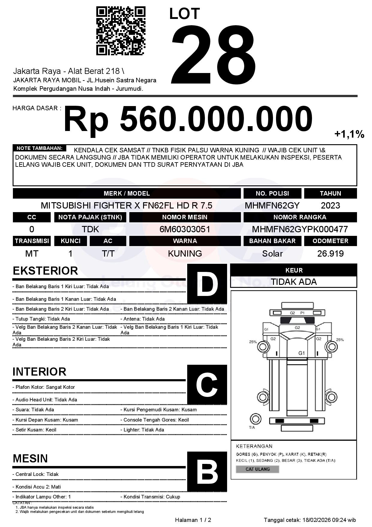 - CatatanKENDALA CEK SAMSAT // TNKB FISIK PALSU WARNA KUNING // WAJIB CEK UNIT & DOKUMEN SECARA LANGSUNG // JBA TIDAK MEMILIKI OPERATOR UNTUK MELAKUKAN INSPEKSI, PESERTA LELANG WAJIB CEK UNIT, DOKUMEN DAN TTD SURAT PERNYATAAN DI JBA