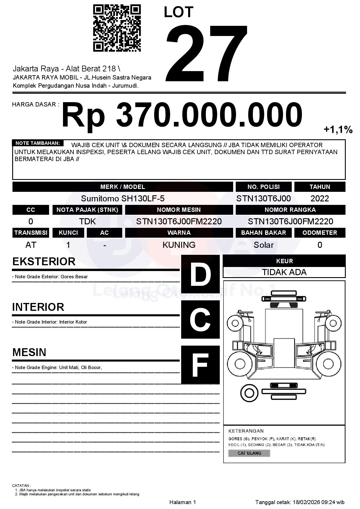 - CatatanWAJIB CEK UNIT & DOKUMEN SECARA LANGSUNG // JBA TIDAK MEMILIKI OPERATOR UNTUK MELAKUKAN INSPEKSI, PESERTA LELANG WAJIB CEK UNIT, DOKUMEN DAN TTD SURAT PERNYATAAN BERMATERAI DI JBA //