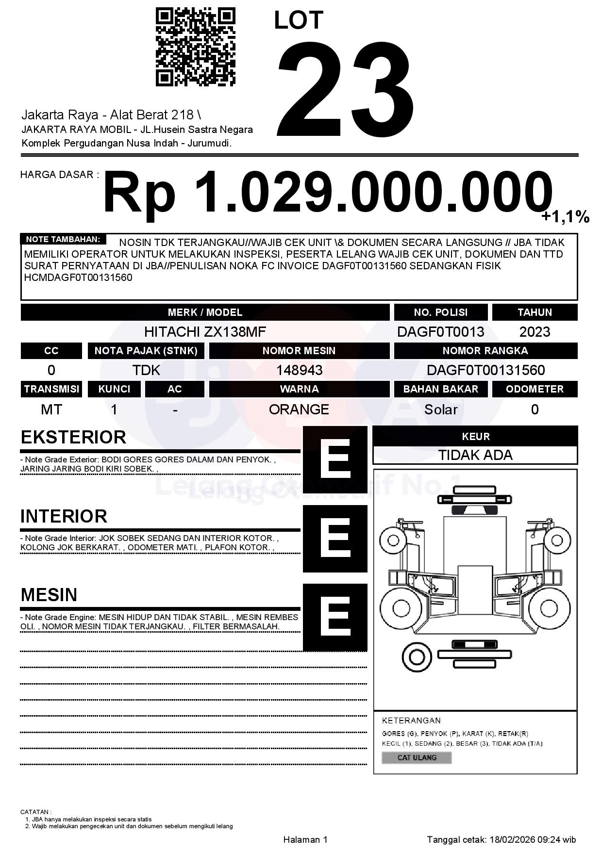- CatatanNOSIN TDK TERJANGKAU//WAJIB CEK UNIT & DOKUMEN SECARA LANGSUNG // JBA TIDAK MEMILIKI OPERATOR UNTUK MELAKUKAN INSPEKSI, PESERTA LELANG WAJIB CEK UNIT, DOKUMEN DAN TTD SURAT PERNYATAAN DI JBA//PENULISAN NOKA FC INVOICE DAGF0T00131560 SEDANGKAN FISIK HCMDAGF0T00131560
