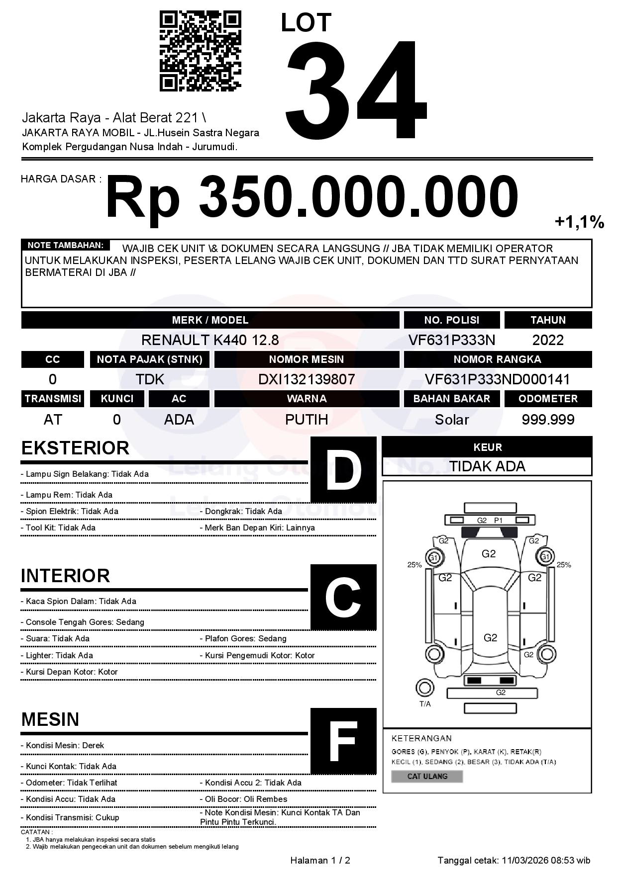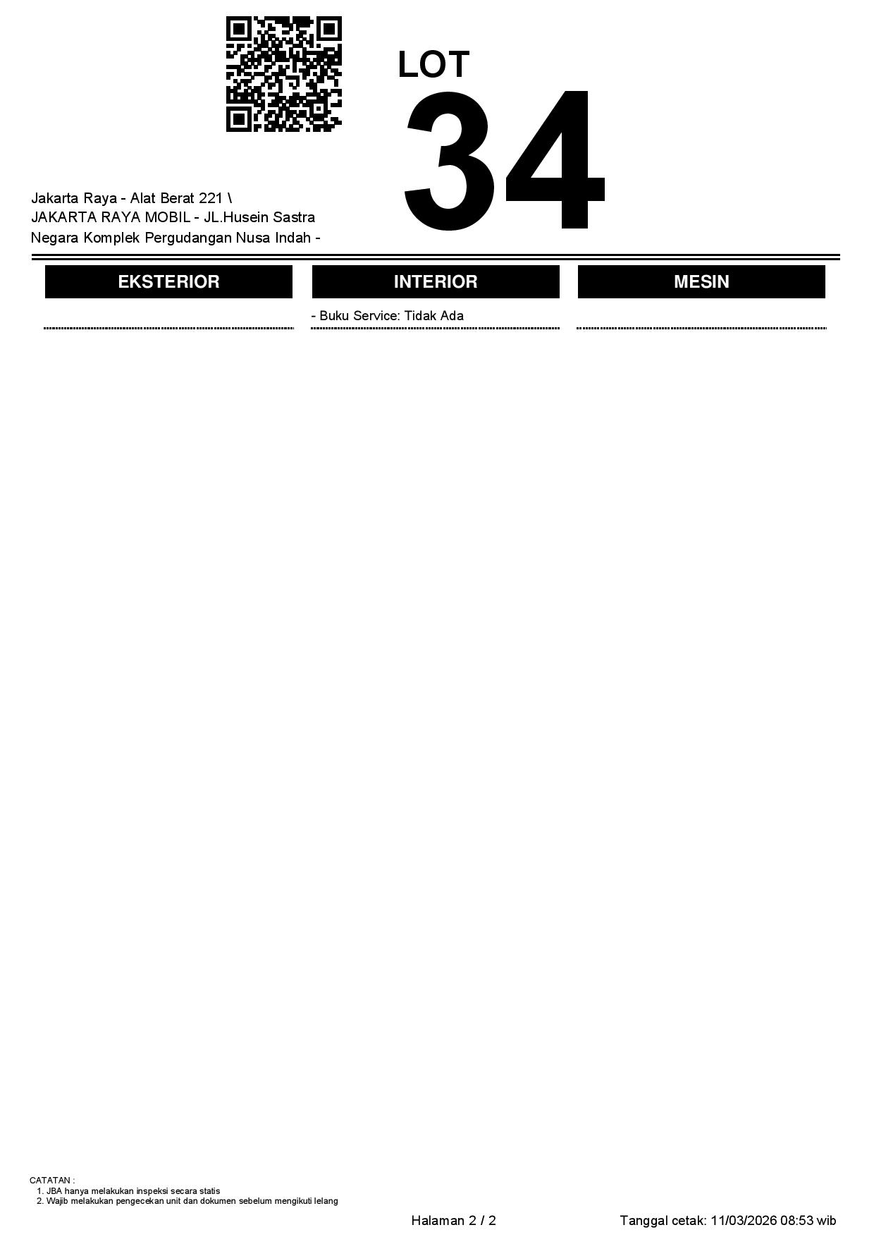 - CatatanWAJIB CEK UNIT & DOKUMEN SECARA LANGSUNG // JBA TIDAK MEMILIKI OPERATOR UNTUK MELAKUKAN INSPEKSI, PESERTA LELANG WAJIB CEK UNIT, DOKUMEN DAN TTD SURAT PERNYATAAN BERMATERAI DI JBA //
