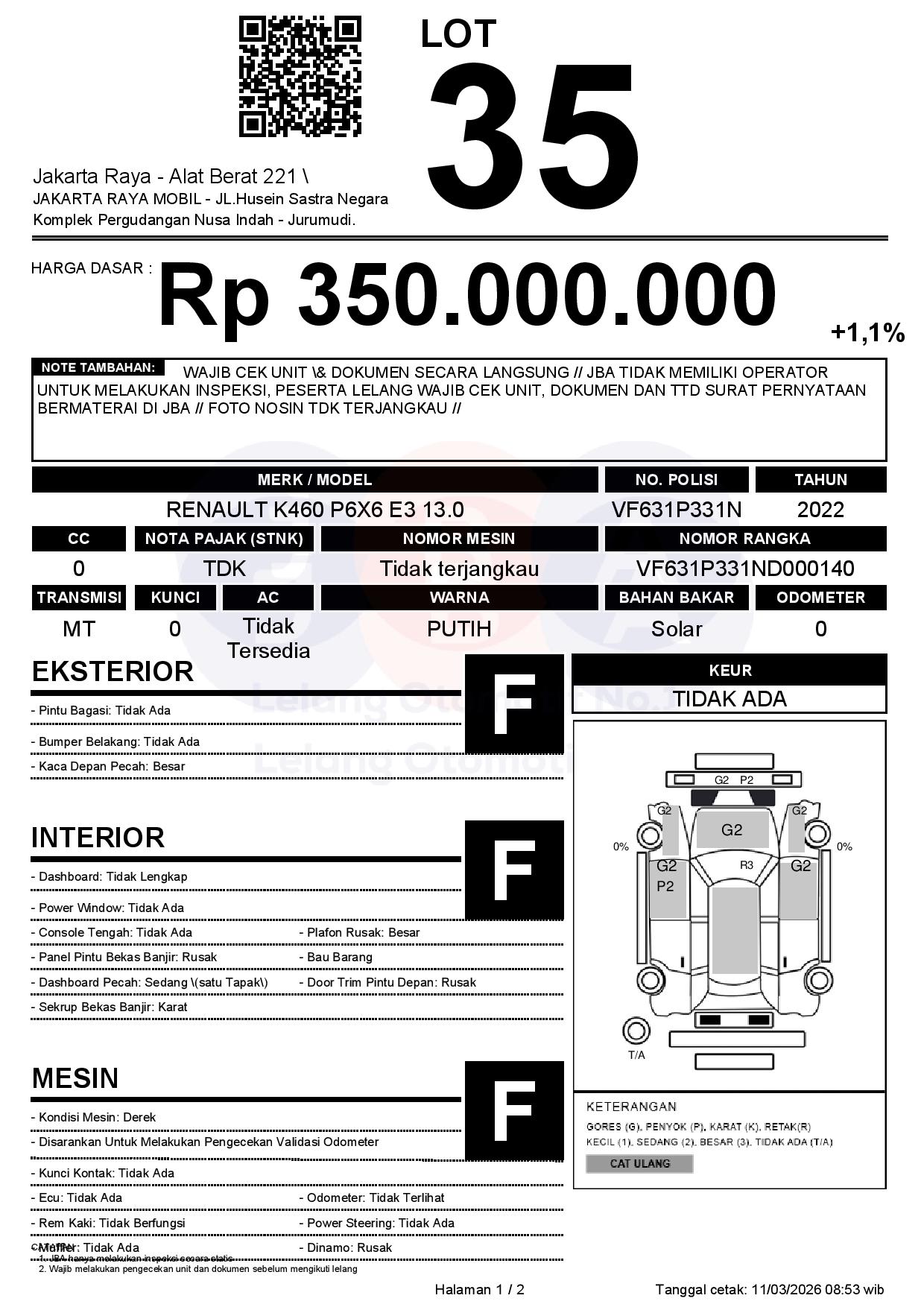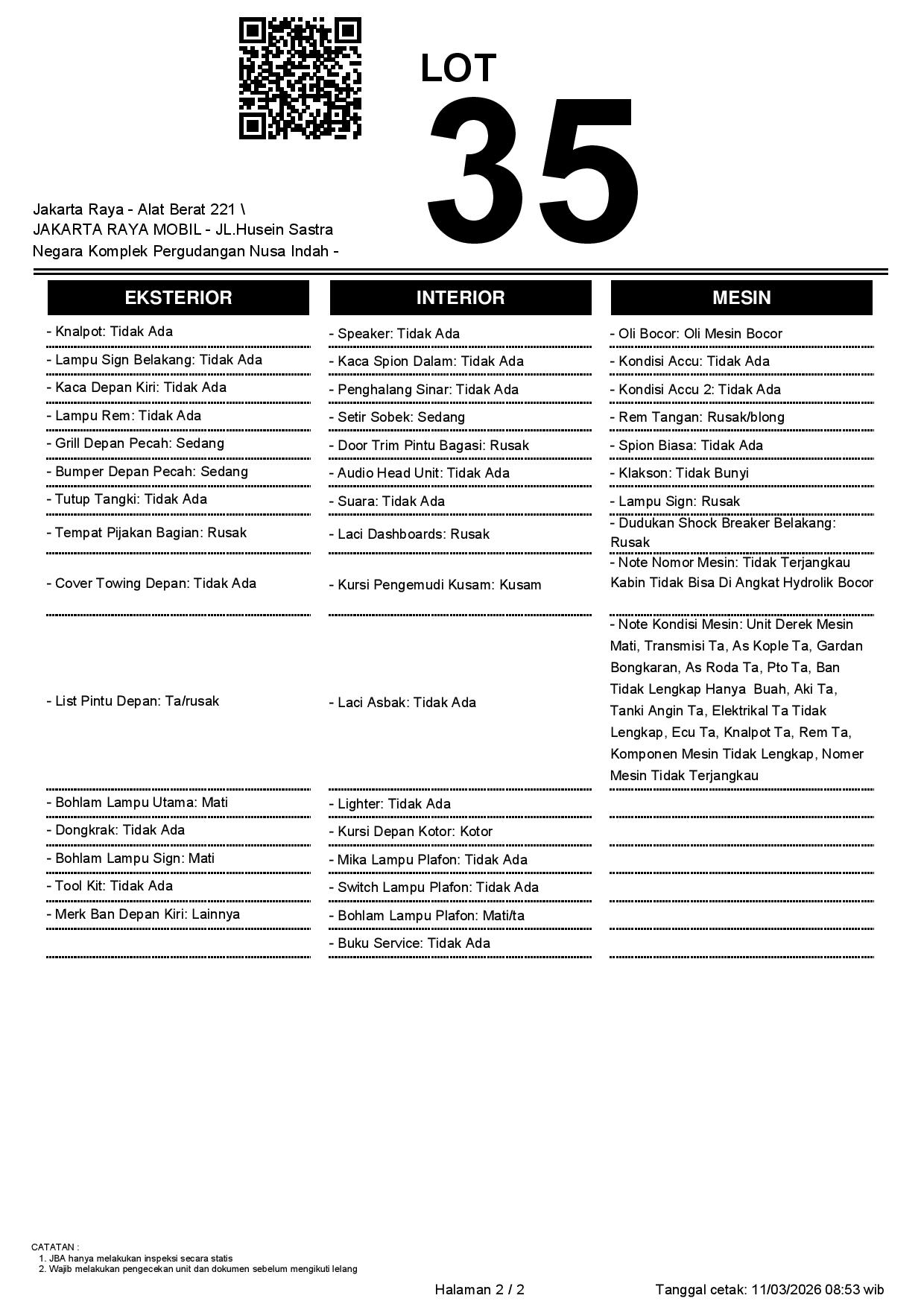 - CatatanWAJIB CEK UNIT & DOKUMEN SECARA LANGSUNG // JBA TIDAK MEMILIKI OPERATOR UNTUK MELAKUKAN INSPEKSI, PESERTA LELANG WAJIB CEK UNIT, DOKUMEN DAN TTD SURAT PERNYATAAN BERMATERAI DI JBA // FOTO NOSIN TDK TERJANGKAU //
