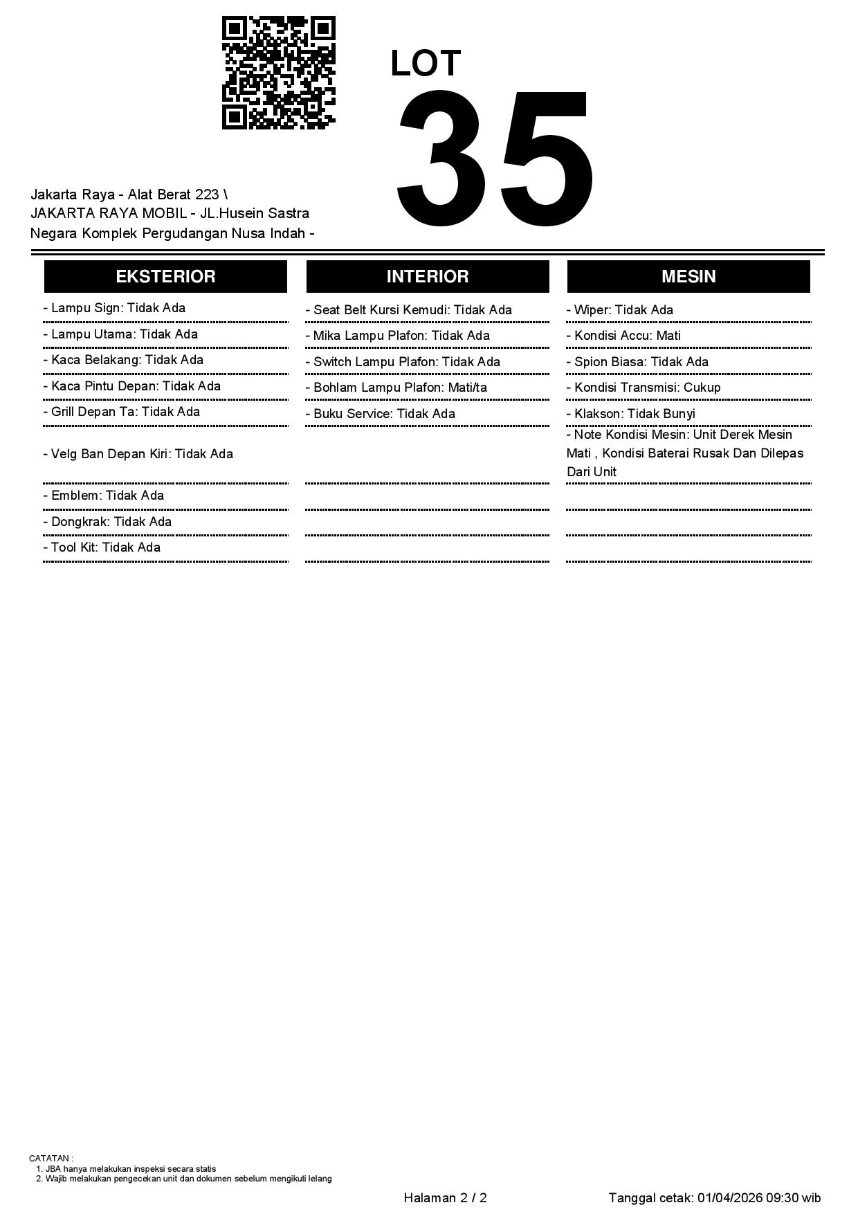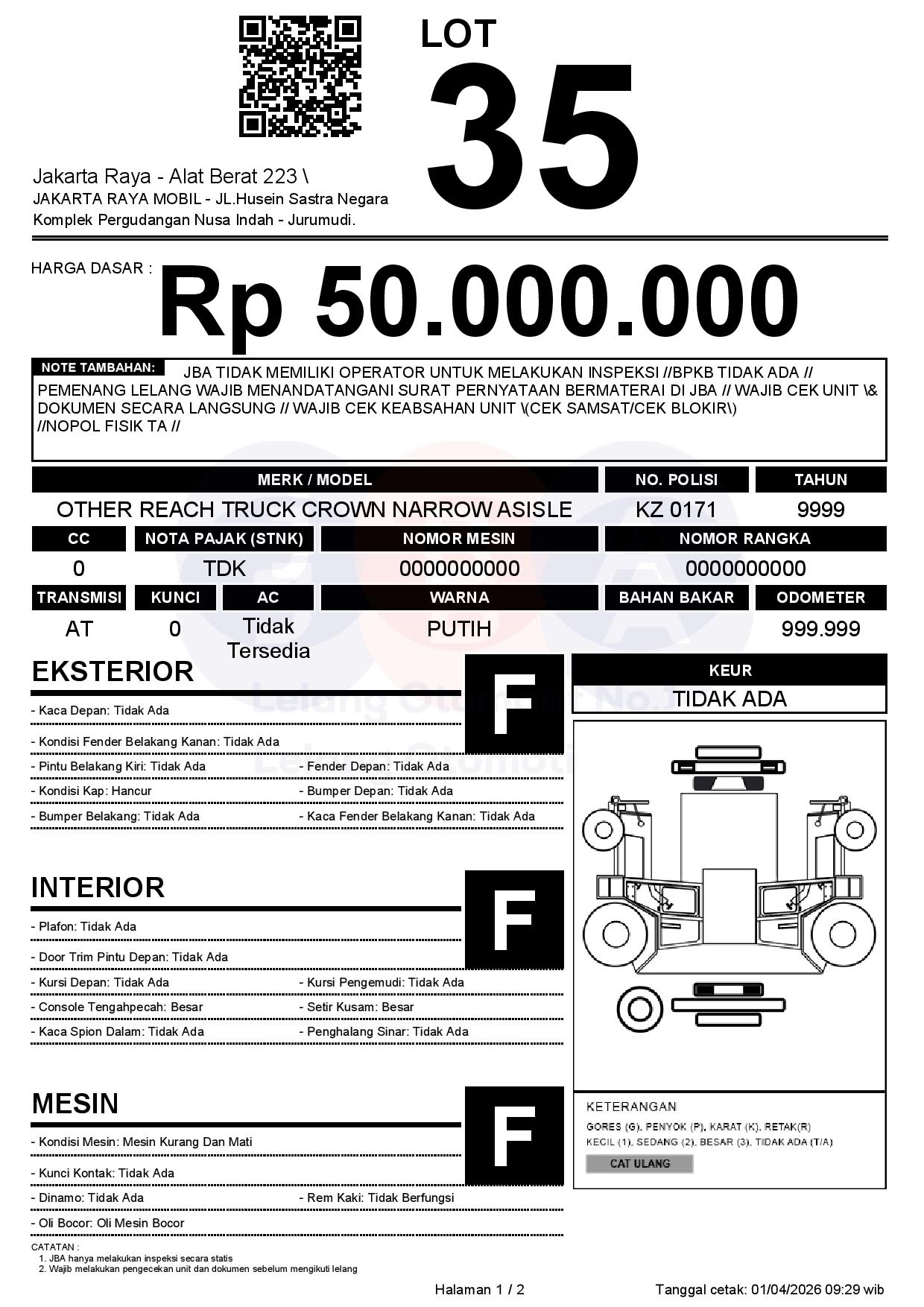 - CatatanJBA TIDAK MEMILIKI OPERATOR UNTUK MELAKUKAN INSPEKSI //BPKB TIDAK ADA // PEMENANG LELANG WAJIB MENANDATANGANI SURAT PERNYATAAN BERMATERAI DI JBA // WAJIB CEK UNIT & DOKUMEN SECARA LANGSUNG // WAJIB CEK KEABSAHAN UNIT (CEK SAMSAT/CEK BLOKIR) //NOPOL FISIK TA //
