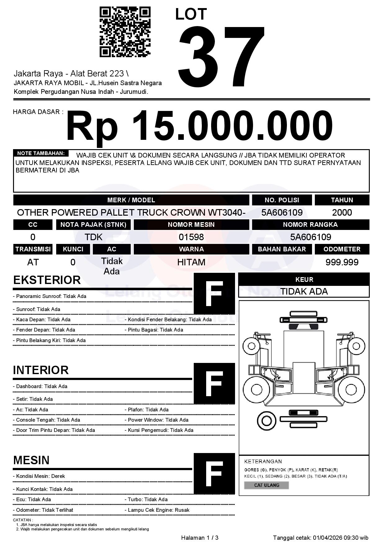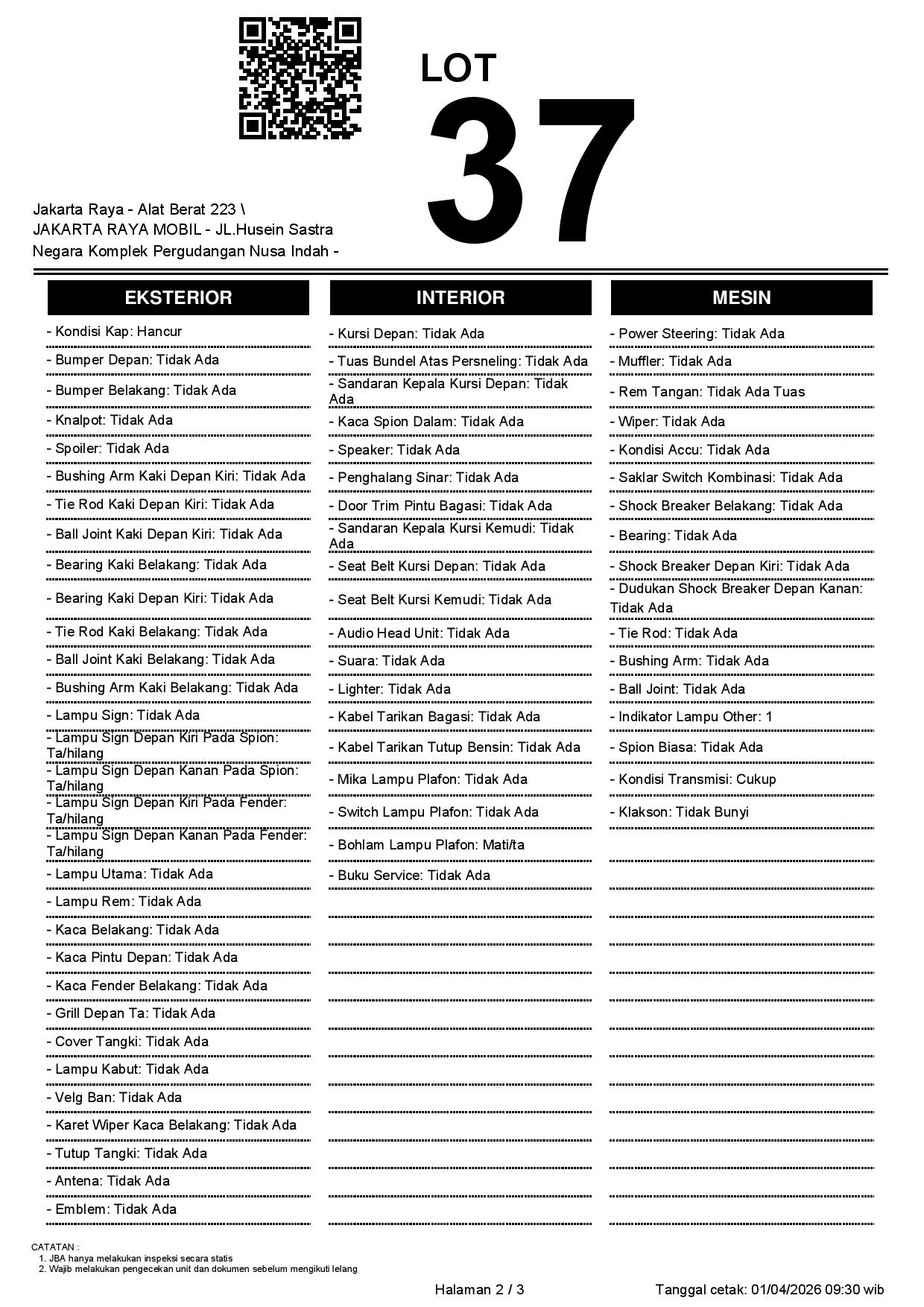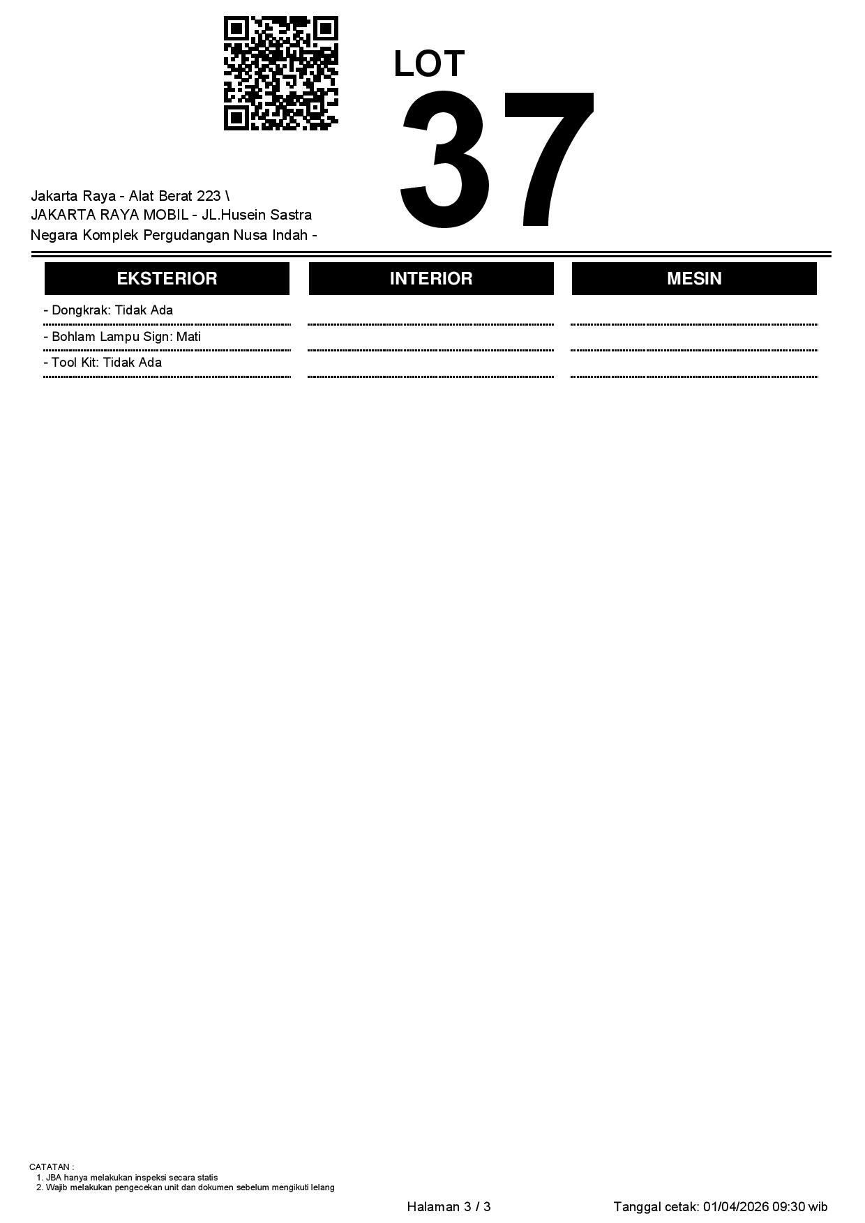 - CatatanWAJIB CEK UNIT & DOKUMEN SECARA LANGSUNG // JBA TIDAK MEMILIKI OPERATOR UNTUK MELAKUKAN INSPEKSI, PESERTA LELANG WAJIB CEK UNIT, DOKUMEN DAN TTD SURAT PERNYATAAN BERMATERAI DI JBA