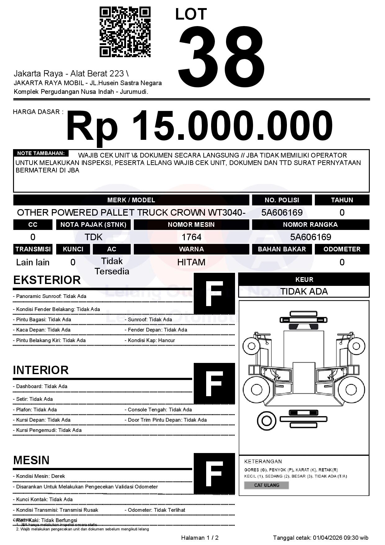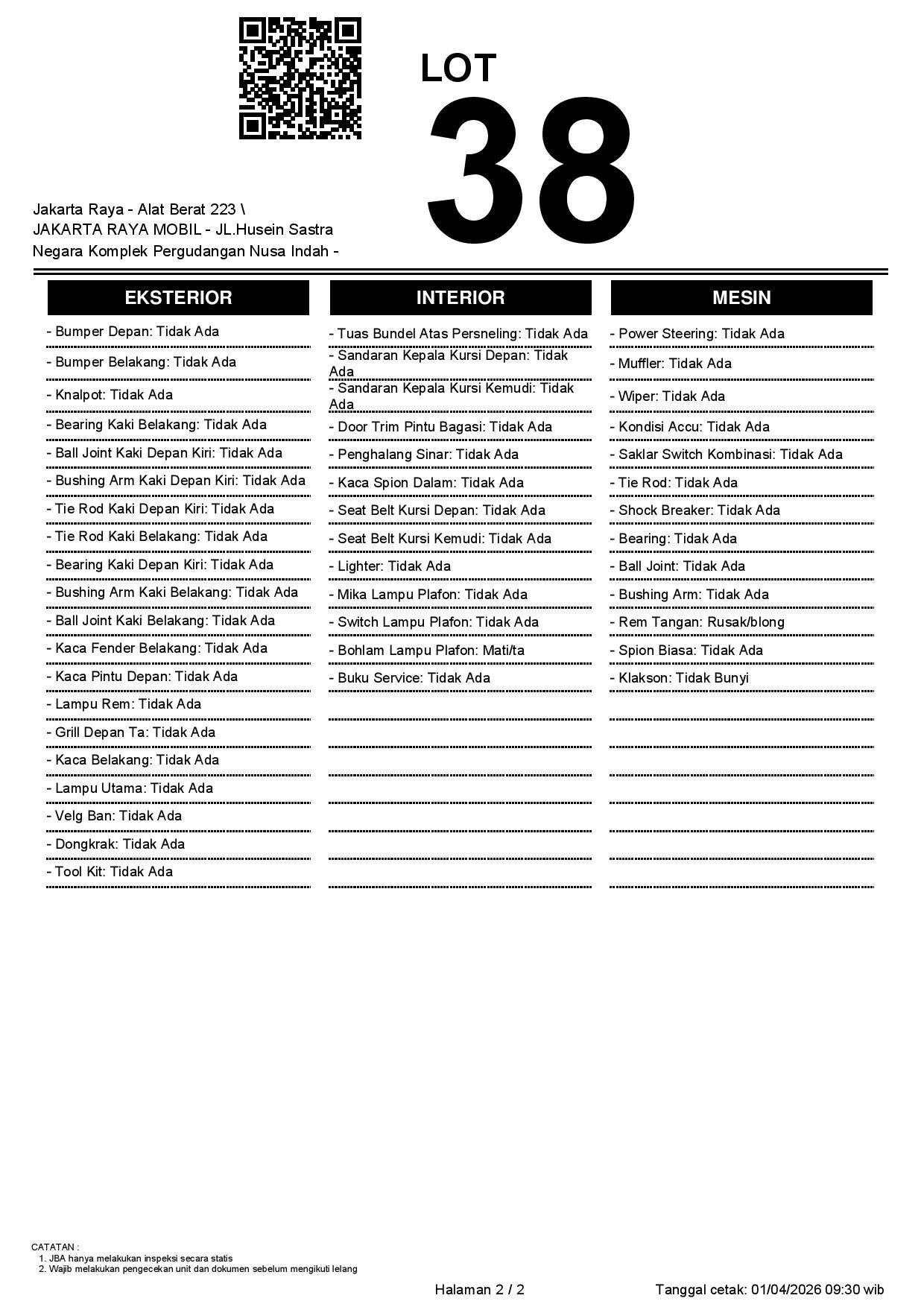 - Catatan WAJIB CEK UNIT & DOKUMEN SECARA LANGSUNG // JBA TIDAK MEMILIKI OPERATOR UNTUK MELAKUKAN INSPEKSI, PESERTA LELANG WAJIB CEK UNIT, DOKUMEN DAN TTD SURAT PERNYATAAN BERMATERAI DI JBA
