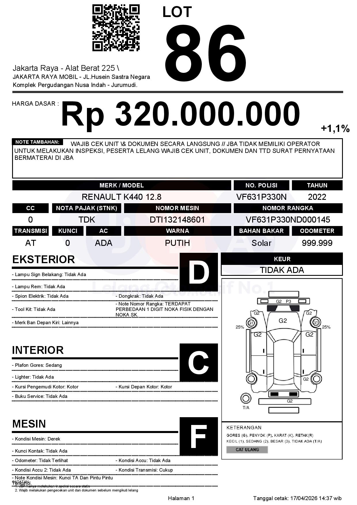- CatatanWAJIB CEK UNIT & DOKUMEN SECARA LANGSUNG // JBA TIDAK MEMILIKI OPERATOR UNTUK MELAKUKAN INSPEKSI, PESERTA LELANG WAJIB CEK UNIT, DOKUMEN DAN TTD SURAT PERNYATAAN BERMATERAI DI JBA