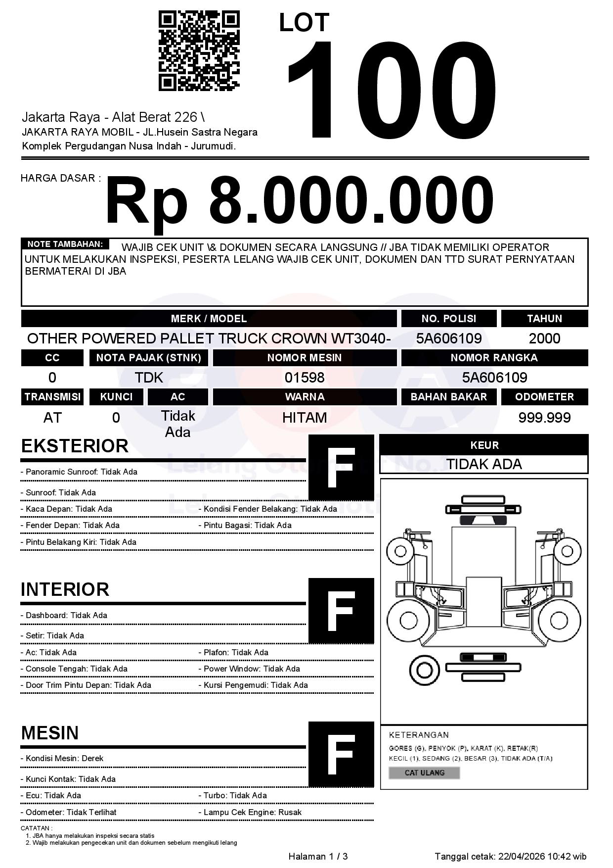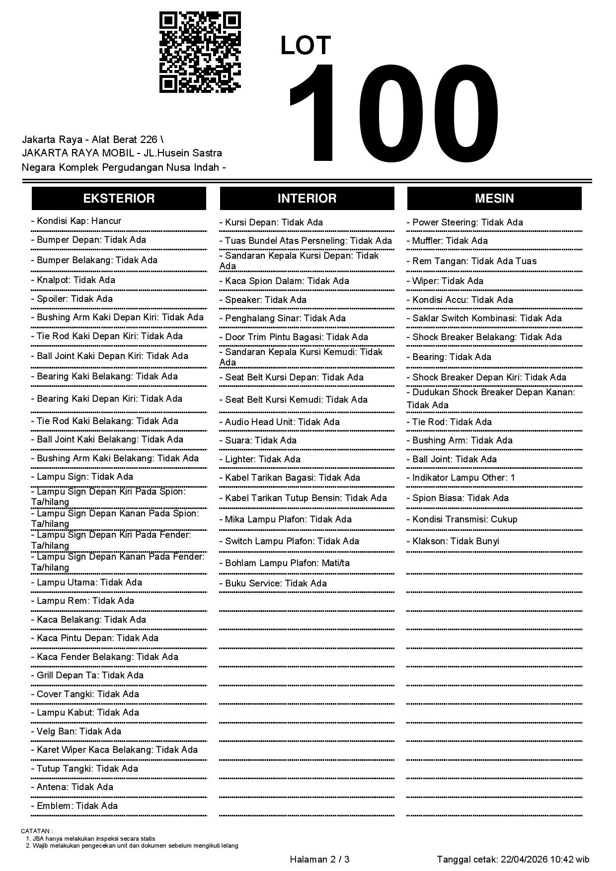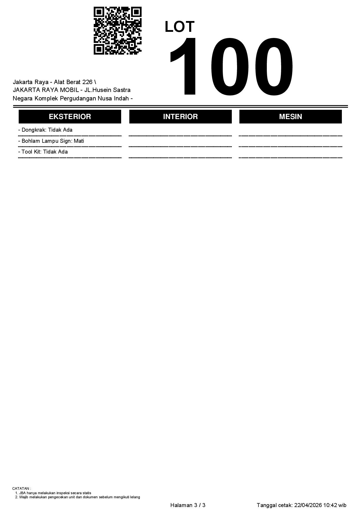 - CatatanWAJIB CEK UNIT & DOKUMEN SECARA LANGSUNG // JBA TIDAK MEMILIKI OPERATOR UNTUK MELAKUKAN INSPEKSI, PESERTA LELANG WAJIB CEK UNIT, DOKUMEN DAN TTD SURAT PERNYATAAN BERMATERAI DI JBA